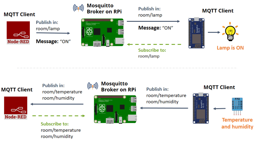 The ESP8266 is subscribed to the room/lamp topic to receive the messages published on that topic by the Node-RED application, to turn the lamp on or off.