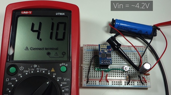 Let’s power the circuit and test it. Having the multimeter measuring the Vin voltage of the LiPo battery, you can see it outputs approximately 4.2V, because the battery is currently fully charged.