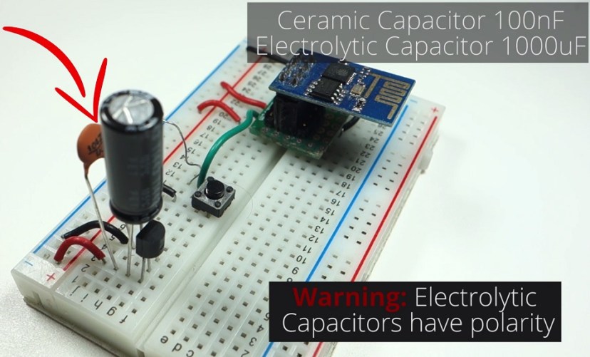 The 1000 uF capacitor will supply more current when the ESP is transmitting. It will work as a reservoir. You can start with a smaller capacitor like 100, 220,330,470 if you don’t have a 1000 uF capacitor.