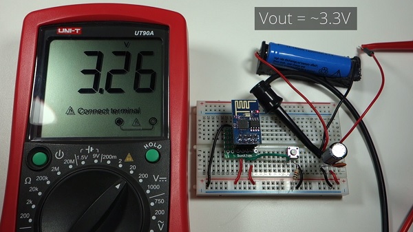 Let’s place the multimeter probe on Vout. Now, the multimeter is measuring approximately 3.3V which is the recommended voltage to power the ESP8266.