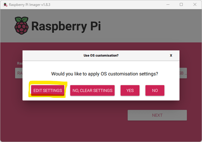 9) Click Next. Next, you’ll be asked if you would like to apply customisation settings. Click on Edit Settings to set up the Wi-Fi credentials, and enable SSH.