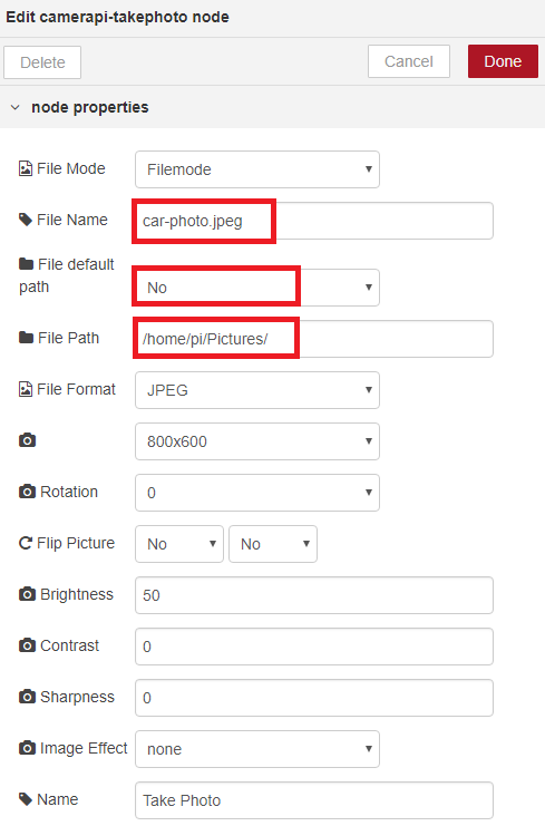 - The Take Photo node is storing the photo in the right file path: /home/pi/Pictures/