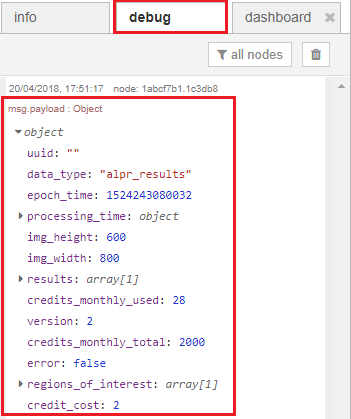 Open the debug window, and you should see an object with all the details about the JSON response. The results array should have at least one result (array[1]), otherwise it might be analyzing a photo without a car or it couldn’t identify the car (make sure the Pi Camera is pointed to the car while you take the photo).