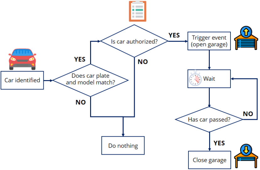 Here’s what happens: after the car has been identified by OpenALPR, we’ll check if the license plate and the car model match. If they match, we’ll check if the car is in the list of authorized vehicles. If it is, we’ll trigger an event. For example: open the garage. After that, we wait a determined period of time until the car enters the garage. Then, you need to add several verifications to check if the car has already entered the garage. If yes, you can close the garage.