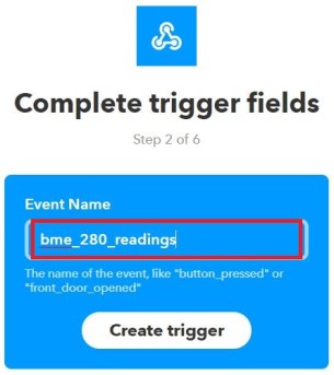 5) Give a name to the event. In this case, we’ll be using “bme_280_readings” and we recommend using that exact same event name as shown in the figure below. After that, click the “Create trigger” button.