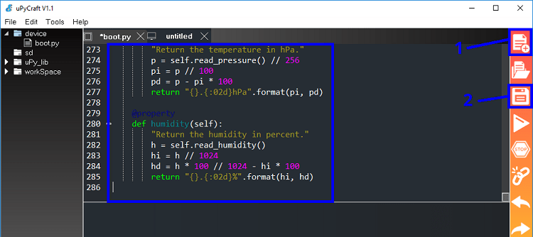 In uPyCraft IDE, create a new file by pressing the New File button (1). Copy the BME280 library code into it. The BME280 library code can be found in the following link: