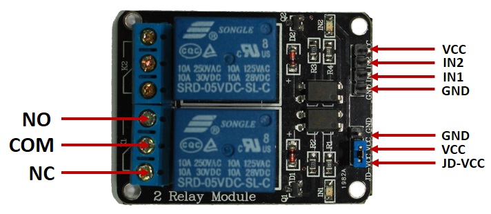 The second set of pins consists of GND, VCC, and JD-VCC pins. The JD-VCC pin powers the electromagnet of the relay.