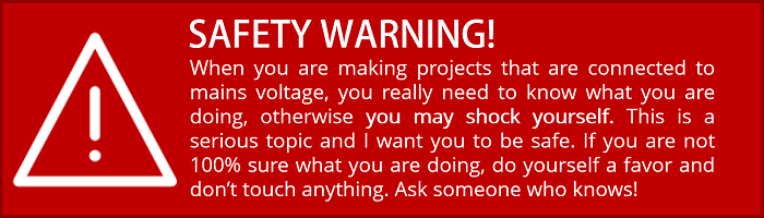Note: if you’re not comfortable dealing with mains voltage, but you still want to try to do the project,  you can replace the relay module with an LED, for example. The code and the schematics are very similar.