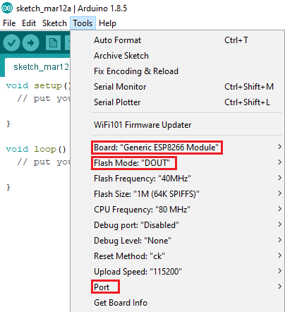- Choose your ESP8266 board from Tools> Board > Generic ESP8266 Module