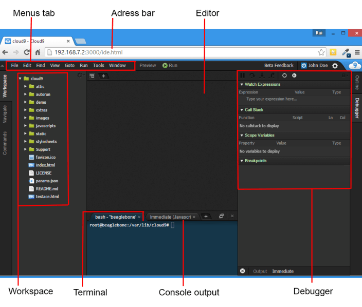 Menus tab:Â Like any computer application the menus in the Cloud9 IDE are organized in a very familiar way: File, Edit, Find, View, Goto, Run, Tools and Window.