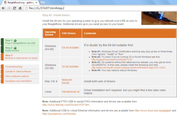 You should see in your START.htm web page a table that lists the various operating systems and their USB drivers, like the following figure. Simply select the USB drivers for your OS and follow the instructions to install them.
