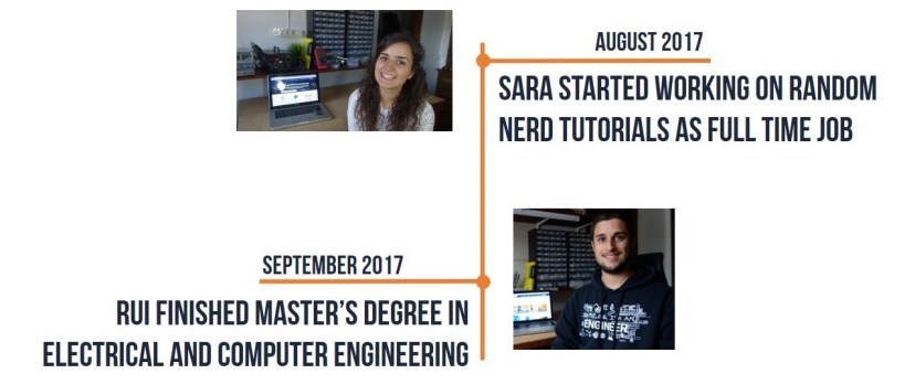 With the Random Nerd Tutorials community getting bigger and bigger, I (Rui) couldn’t do everything on my own. Sara has been helping me on Random Nerd Tutorials since 2015, and in August 2017 she quite her job and started working on Random Nerd Tutorials as her full time job.