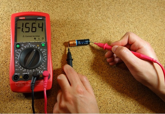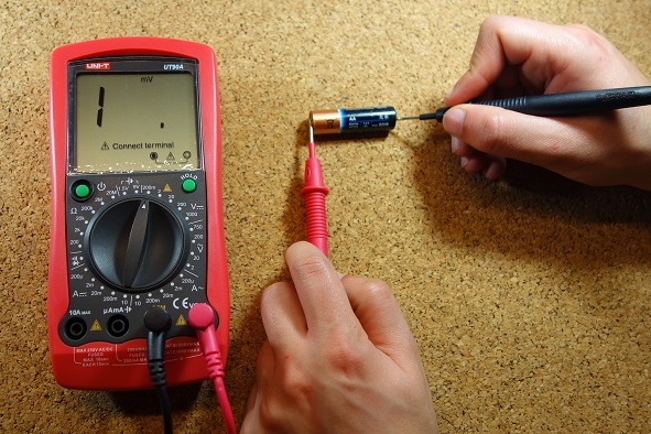 In this example we’re going to measure the voltage of a 1.5V battery. You know that you’ll have approximately 1.5V. So, you should select a range with the selection knob that can read the 1.5V. So you should select 2V in the case of this multimeter. If you have an autorange multimeter, you don’t have to worry about the range you need to select.