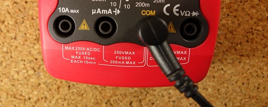 The “COM” or “–“ port is where the black probe should be connected. The COM probe is conventionally black.