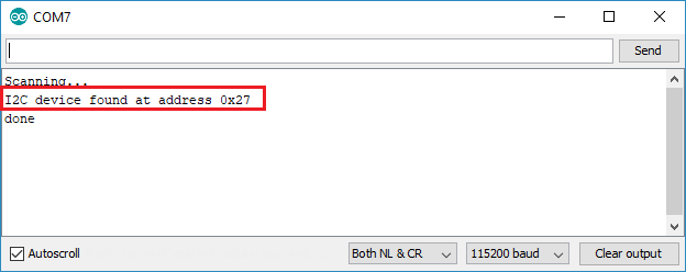 In this case the address is 0x27. If you’re using a similar 16×2 display, you’ll probably get the same address.