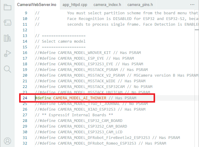 So, comment all the other models and uncomment the CAMERA_MODEL_AI_THINKER: