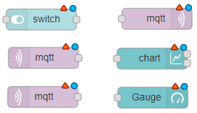 From the dashboard section at the left sidebar, drag a switch, a chart, and a gauge node to the flow. Then drag two MQTT in and one MQTT out node to the flow (they are under the network section)âsee the figure below.