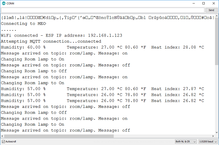 Now, you can upload the following code to your ESP8266. This code publishes messages with the temperature and humidity from the DHT11 sensor on the room/temperature and room/humidity topics via MQTT protocol.