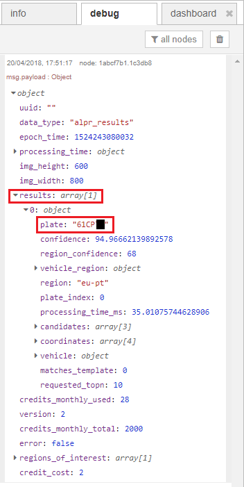 Click the arrow next to the results: array[1] to expand the object. You should see a plate object with your car plate. Save the car plate in the format retrieved by the API. In my case it’s “61CP–“. You’ll need it later to identify your car: