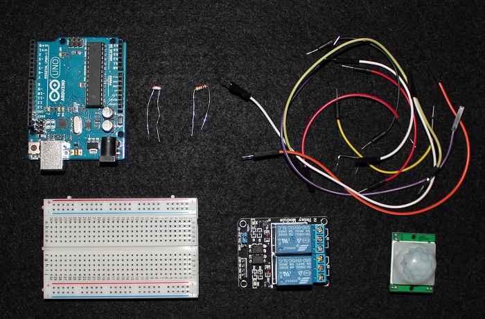 In this project you’re going to build a night security light with a relay module, a photoresistor and an Arduino.