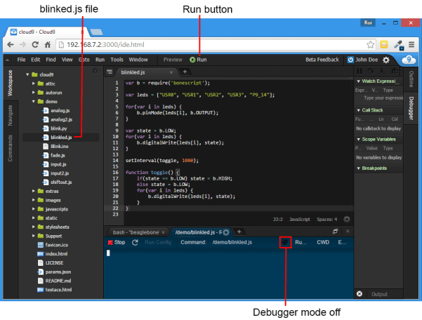 In your workspace area open your “demo” folder and double-click the file “blinked.js”. This basic script blinks all four USR LEDs and also pin P9_14 in your BeagleBone Black.