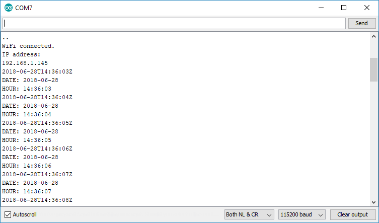 Upload the code to the ESP32. Make sure you have the right board and COM port selected. After uploading the code, press the ESP32 “Enable” button, and you should get the date and time every second as shown in the following figure.