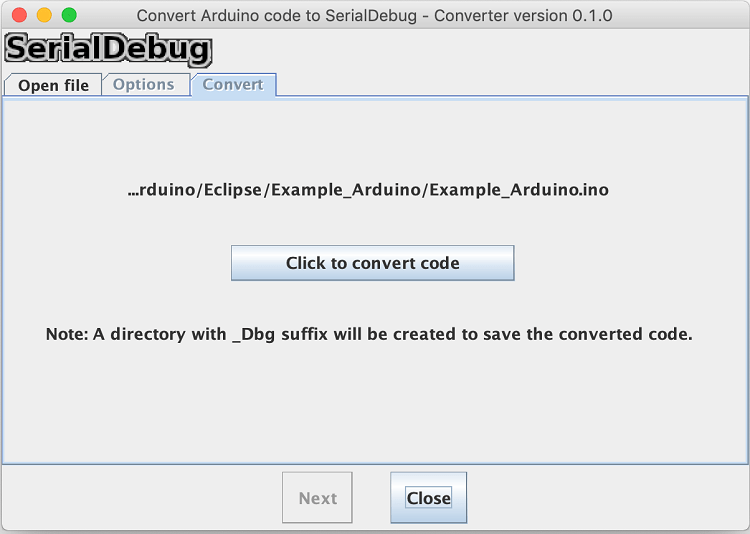 Migrating the code to use SerialDebug is very simple. There is a converter that reads existing Arduino code and generates a new directory with the code converted and ready to use.