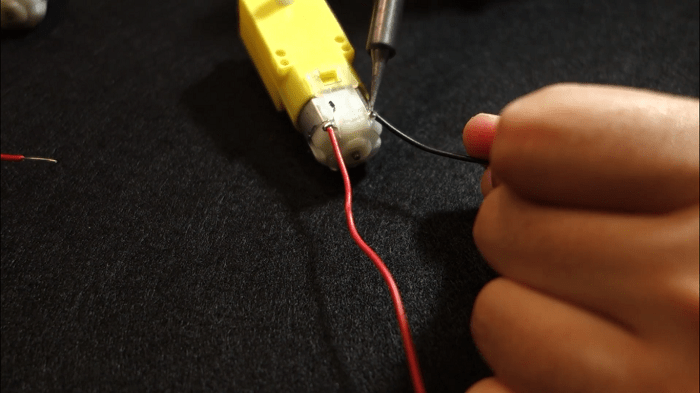 4) After preparing all four wires, you need to solder them to the DC motors. Tin the DC motor pins.