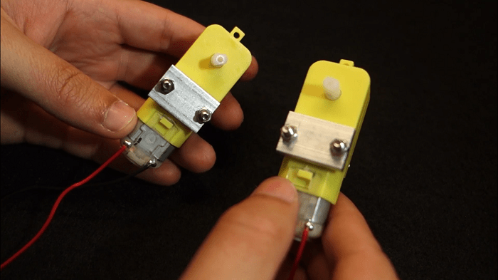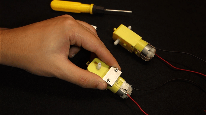 6) Now, you need the screwdriver, bolts and screws, and those metal pieces. Start by attaching the metal pieces to the DC motors.