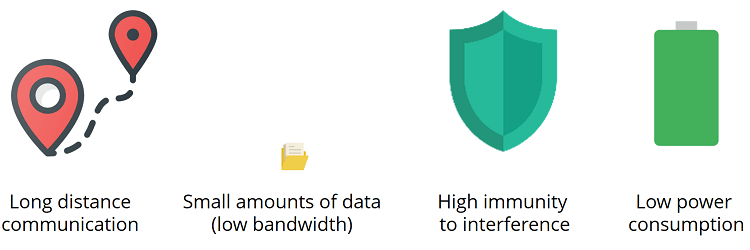 This modulation technique allows long range communication of small amounts of data (which means a low bandwidth), high immunity to interference, while minimizing power consumption. So, it allows long distance communication with low power requirements.