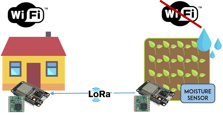 Imagine that you want to measure the moisture in your field. Although, it is not far from your house, it probably doesn’t have Wi-Fi coverage. So, you can build a sensor node with an ESP32 and a moisture sensor, that sends the moisture readings once or twice a day to another ESP32 using LoRa.